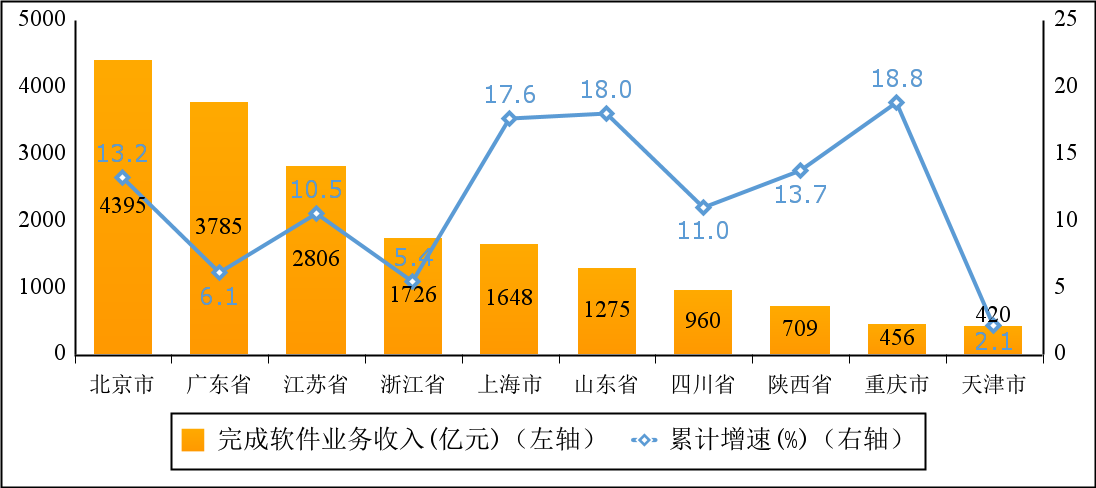 主要软件大省业务收入占比小幅下降。一季度,软件业务收入居前5名的省份中,北京市、广东省、江苏省、浙江省、上海市软件收入分别为4395亿元、3785亿元、2806亿元、1726亿元和1648亿元,分别增长13.2%、6.1%、10.5%、5.4%和17.6%,五省(市)合计软件业务收入14360亿元,占全国比重为71.6%,占比较去年同期回落0.8个百分点。